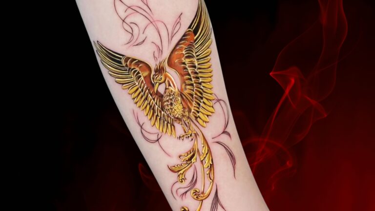 If you love classic tattoos that will definitely always be in style, you can opt for something like this. A phoenix rising from ashes is a universal symbol of rebirth, but also resilience and strength. I love the design of this one and the bright golden color.
