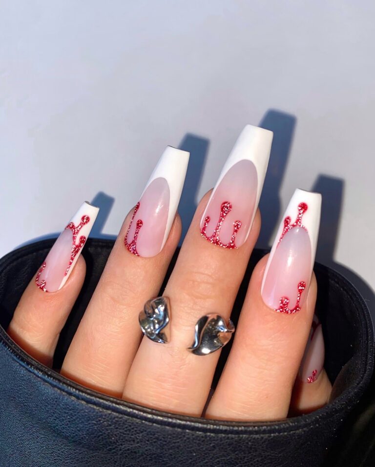 12. Crimson Drip French Coffin Nails (Coffin Nail Ideas)Credit