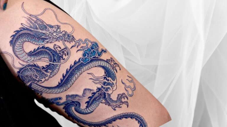 Here’s another blue tattoo design I’m sure you’ll fall in love with! This sleeve tattoo is very intricate and depicts a fierce dragon wrapper around the arm. There are also numerous oriental and floral details that complement the tattoo so well!