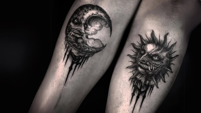 Sun and moon with a dark fantasy edge–absolutely love it! The moon looks like it’s harboring sinister secrets from the night and the sun radiates a feral energy, with sharp rays and a devilish smirk that could burn your very soul. This tattoo is perfect for anyone who loves a touch of the macabre in their body art.