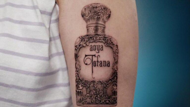 I don’t know if it’s true, but the tale is deeply intriguing. If you’re drawn to its dangerous and daring vibe and are thinking about getting an Aqua Tofana tattoo, here are some cool ideas to inspire you: