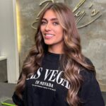 This cut enhances natural thickness with layers styled into soft, voluminous waves. The dark chocolate base is lifted with subtle balayage highlights, adding depth and brightness around the face. The full fringe blends smoothly with the layers, creating a chic and polished look.