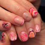 A playful mix of tortoiseshell, grid patterns, floral accents, and neutral speckles adorn short nails. This eclectic style balances seasonal tones with fun details, perfect for those who love variety.
