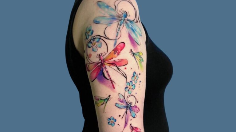 If you want a colorful tattoo that’ll bring joy into your life whenever you look at it, this tattoo design is for you! It’s fun, beautiful, and meaningful considering that dragonflies symbolize transformation and change.