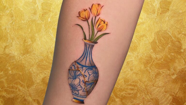 This vase is exactly how Japanese pottery would look after being repaired with gold. I really like the blue design on the vase and the contrast of the yellow tulips in this tattoo.