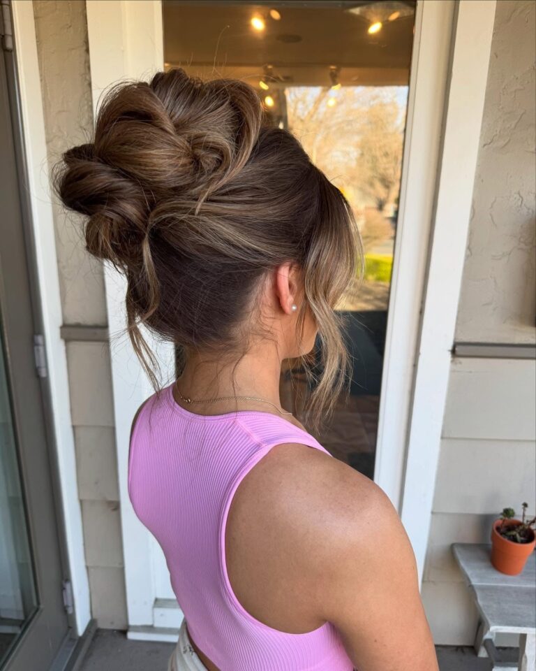 11. Textured Brunette High Bun with Face-Framing Layers (Birthday Hairstyles)Credit