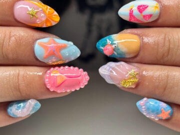 A playful mix of pink and orange shades creates a fresh holiday-ready look. Each nail features a unique detail, from glossy 3D bubbles to floral brushstrokes and golden accents. This design is perfect for those who want their nails to feel lively, fun, and festive during the season.