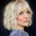This modern curly bob lands right at the chin, featuring soft layering to shape the cut and avoid a boxy finish. The warm brunette shade with subtle caramel accents gives depth, while the tousled fringe adds a lived-in, effortless edge.