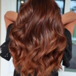 A glossy dark chocolate base is enriched with a veil of cinnamon-toned balayage, weaving warmth throughout. Styled in smooth, cascading waves, this look balances richness with a touch of brightness.
