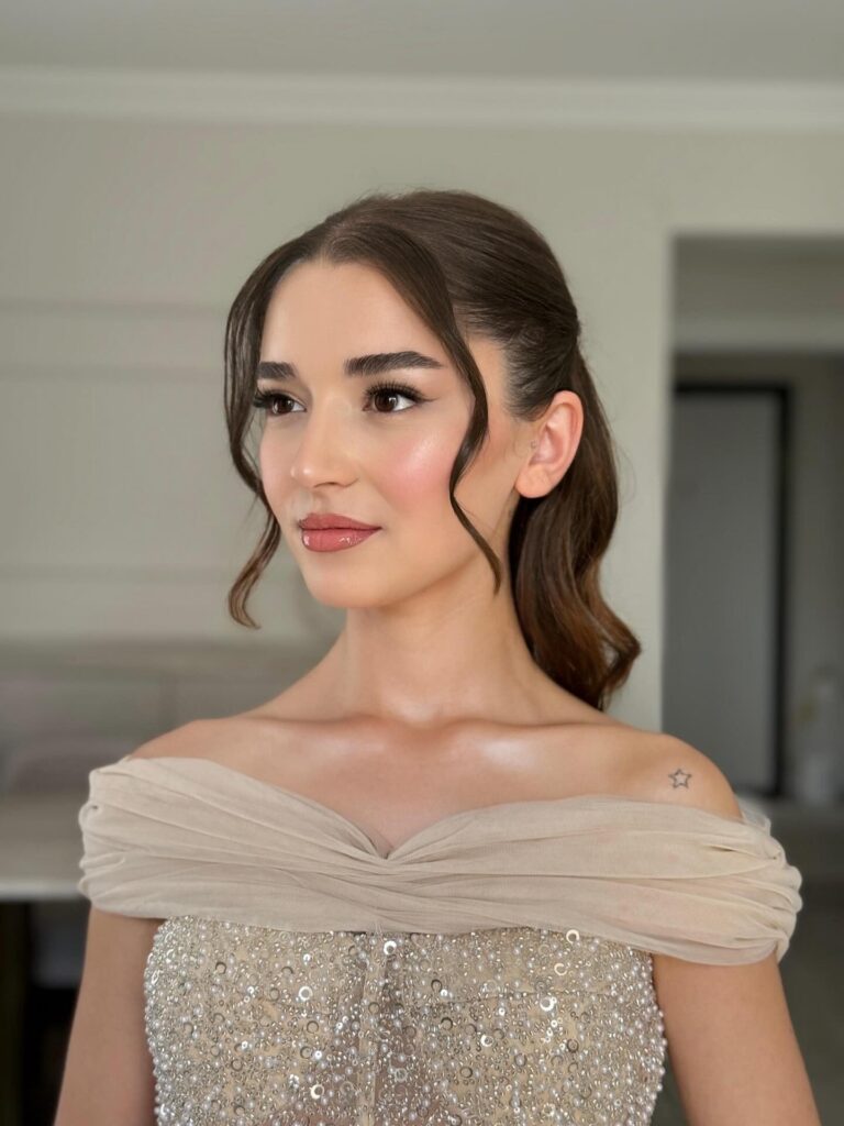 A low ponytail with subtle volume at the crown and loose tendrils around the face offers understated charm. The natural brunette shade keeps the look fresh and graceful.