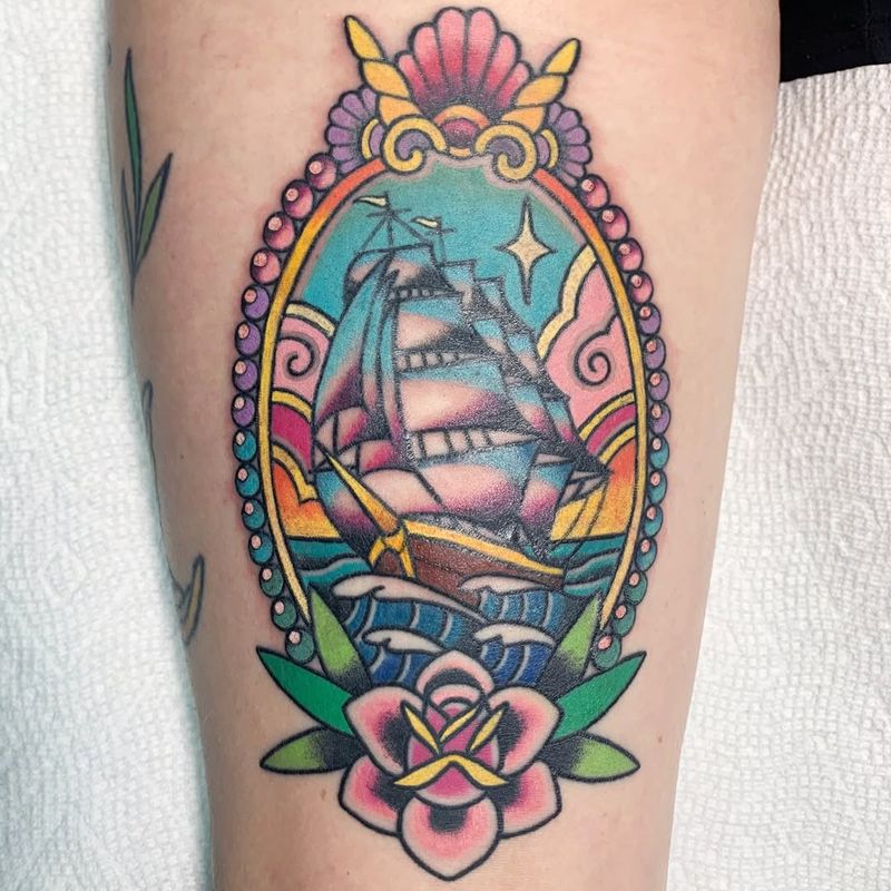 Designed with a classic, vintage aesthetic, this tattoo creates the perfect “frame” to showcase what matters most to you—be it a boat like this example, a cherished portrait, or a meaningful symbol.
