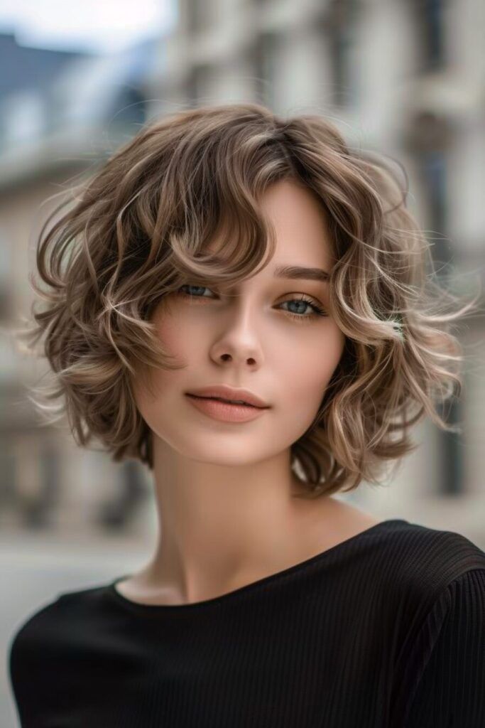This sparkling curly bob displays curtain bangs that not only frame the face delicately but also add a softness and a touch of sophistication. The curls have a natural texture, which allows this hairstyle to be adaptable for school easy hairstyles as well as for outdoor casual activities. It is an ideal choice for ladies who like short wavy hair but still want to keep a little bouncy volume.
