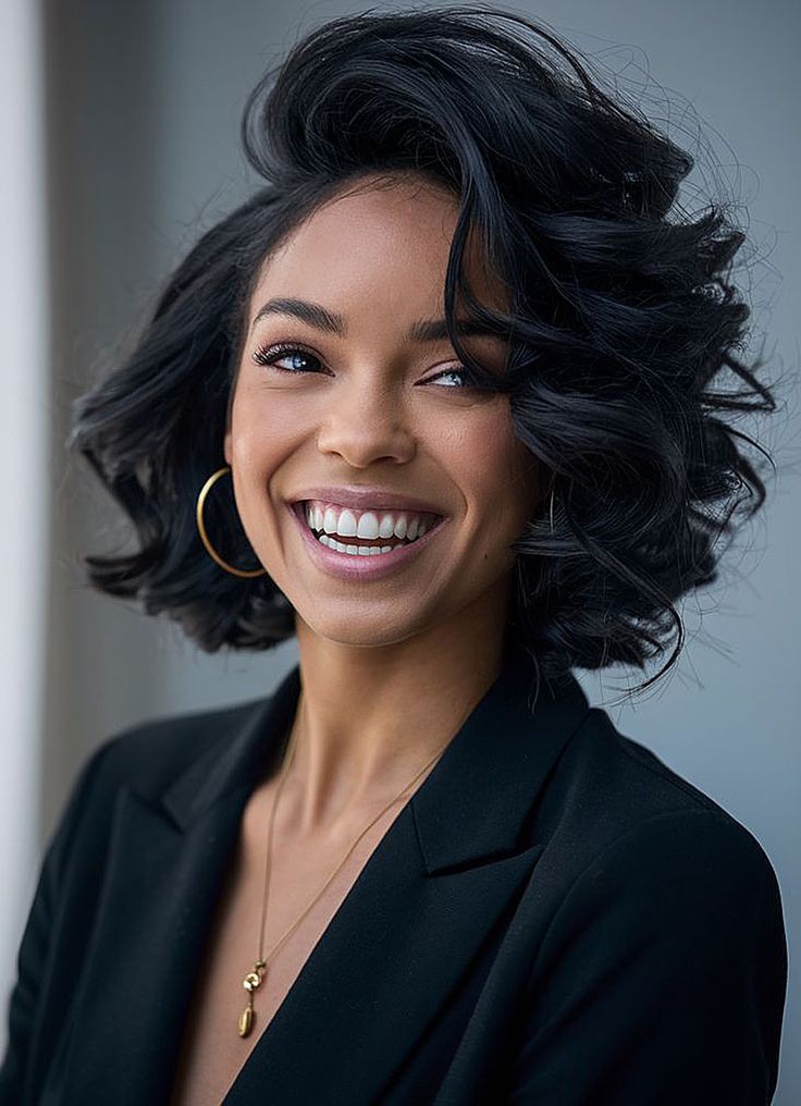 This hairstyle is a lob cut with glossy tight curls that are sitting shoulder-length-math. The middle part gives a sense of balance to the whole look and makes it a superb choice for formal and professional events. The year 2025 school is a perfect choice for this hairstyle, especially for those who love a neat and elegant look.