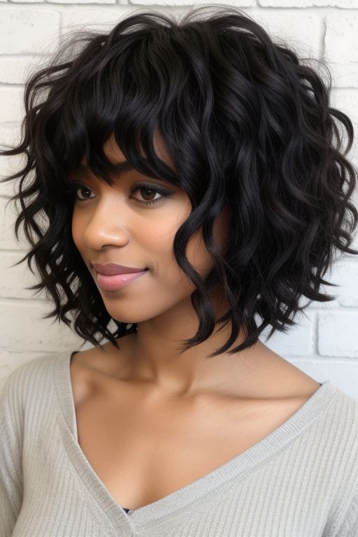2. Soft Curly Bob with Side Bangs