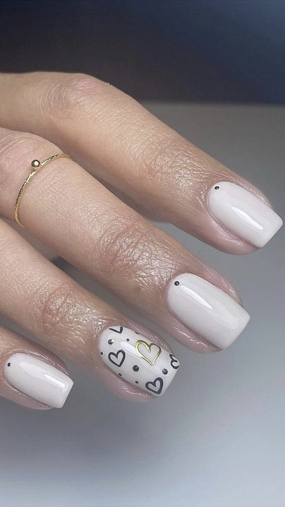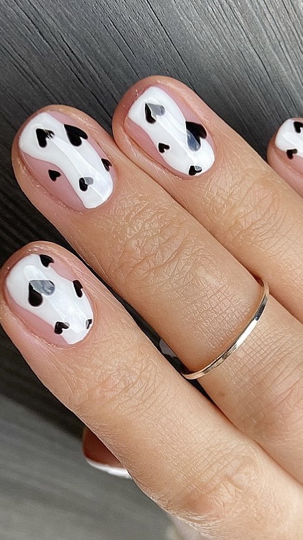 This design is an updated version of the French tips that includes a natural base and black tips plus elegant heart accents, thus merging traditional and modern styles perfectly.