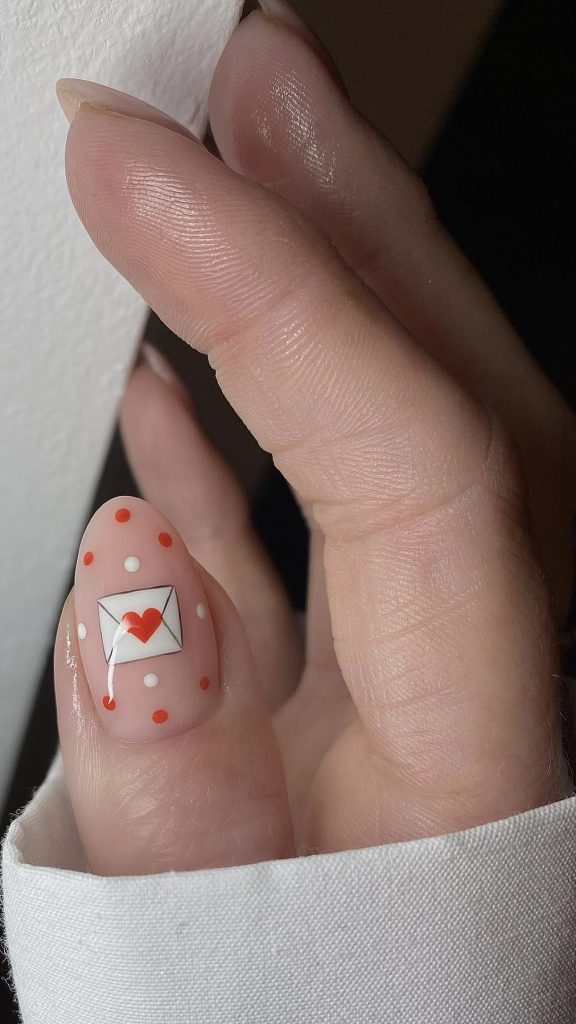 If you are a fun-loving person, you may try a round nail art that features a pink short base. Polka dots move simultaneously with an envelope that has a heart seal. It is a cute reference to the old-fashioned Valentine’s cards and brings a lovely detail to every outfit.