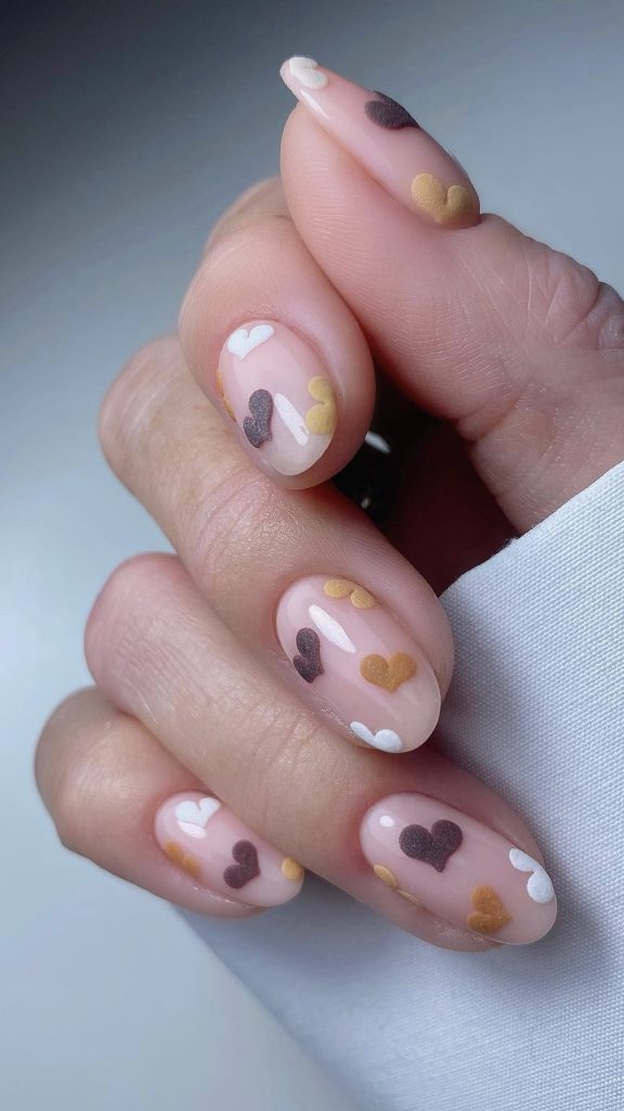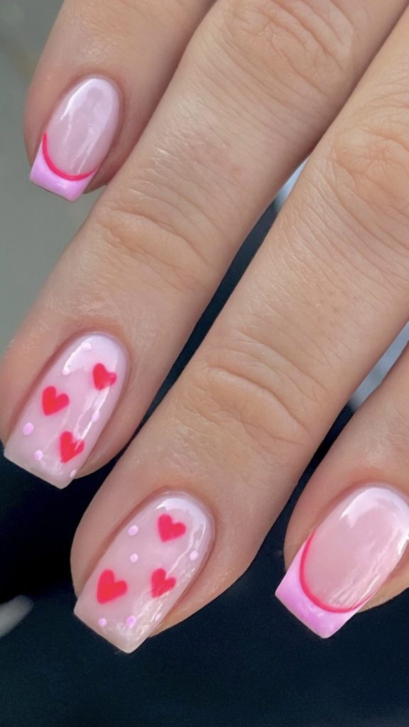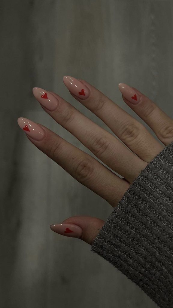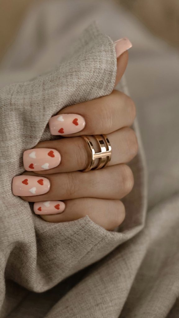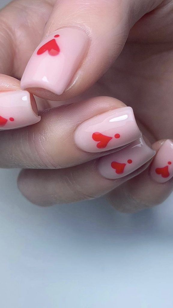 The soft pink nails look magical with the white and red hearts sprinkled on them, so they are suitable for the look in 2024. This design is simple yet beautiful, so it can easily be paired with any Valentine’s Day attire.