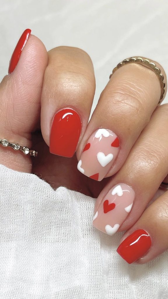 The color combination of red and white is one of the most popular and magical Valentine’s Day colors. The short square nails are pink in the shade of red and the accent nails have a white base that carries a central design of a red heart. This is an absolutely timeless style that would be perfectly worn with a little black dress or a warm knitte.