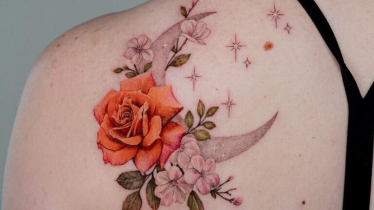 The rose, moon, and stars tattoo is a celestial blend of dreams and beauty. With stars twinkling around the rose, it symbolizes hope and aspiration.