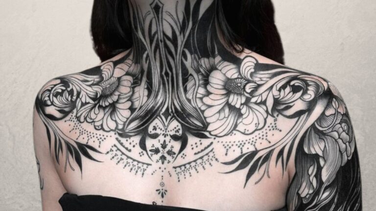 Dark ornamental tattoos are also cool! The one shown here is combined with two big flowers on the sides that look like roses in their full bloom.