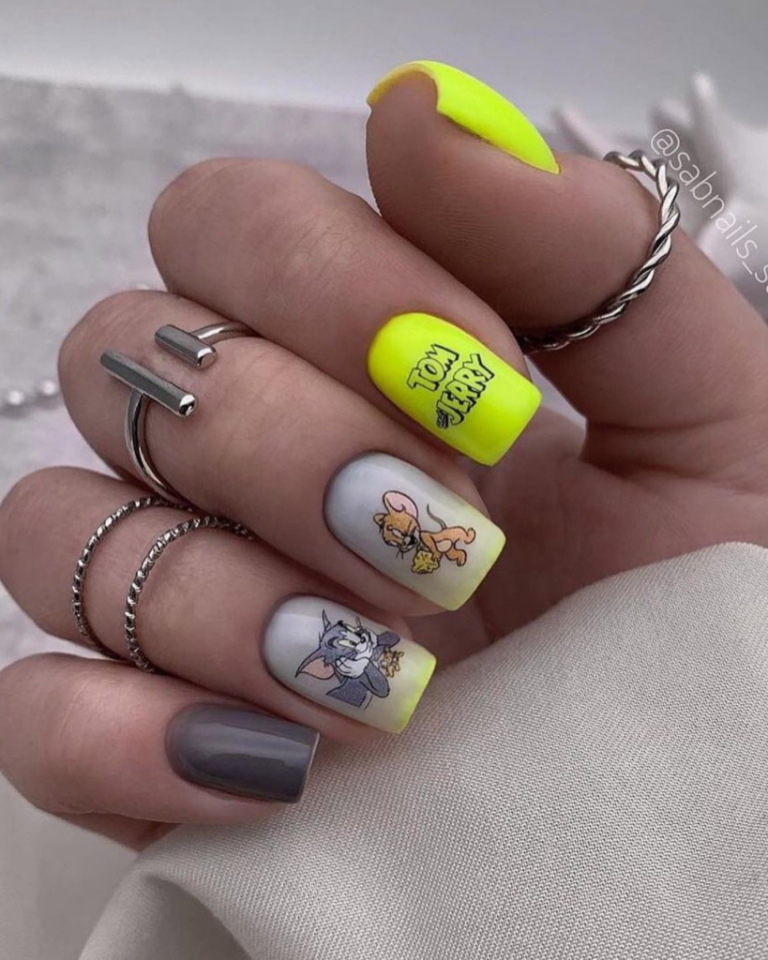 Wisely, this happy nail design will transfer the you the joy back of Saturday morning cartoons. The bright yellow and soft grays are just the perfect backdrop for beloved characters who have added the nostalgic touch completely to your modern appearance. Definitely, such nails will not just be the topic of conversation but also a reason for everybody to smile.