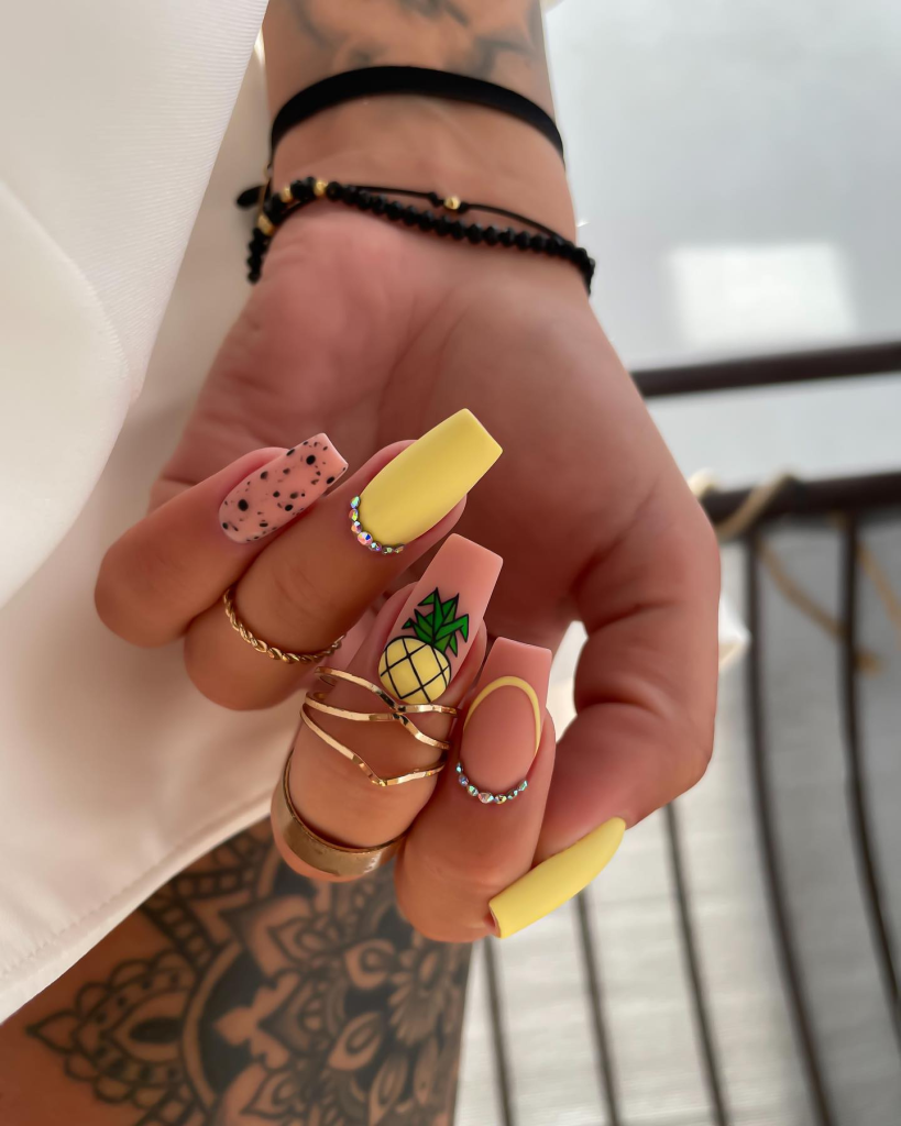 The most common vacations or summer experiences are tropical getaways; how can you think of a better method to bring this holiday mood to your life than with a set of nails that exude sun and fun? This design presents a delightful combination of lively short nails in pastel pink and a stark yellow accent nail. The real star of the show is the masterful pineapple drawing that includes a fun element. This design is great for a day at the beach or sipping a refreshing drink by the pool. The pineapple design is not only cute but it also stands for the warm and generous spirit of the season.