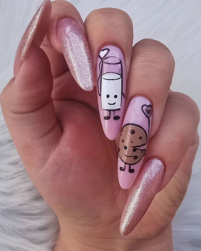 These nails are perfect for the woman who stands for the simple pleasures in life, like a glass of milk and cookies. The soft pink base functions as a canvas where cute illustrated characters are displayed – a beaming glass of milk and a happy cookie that are holding a heart together that signifies their connection. This design is a thing to talk about and most suitable for summertime picnics or casual brunches with friends. It is an endearing sign that summer is not only about heat but also about sweetness.
