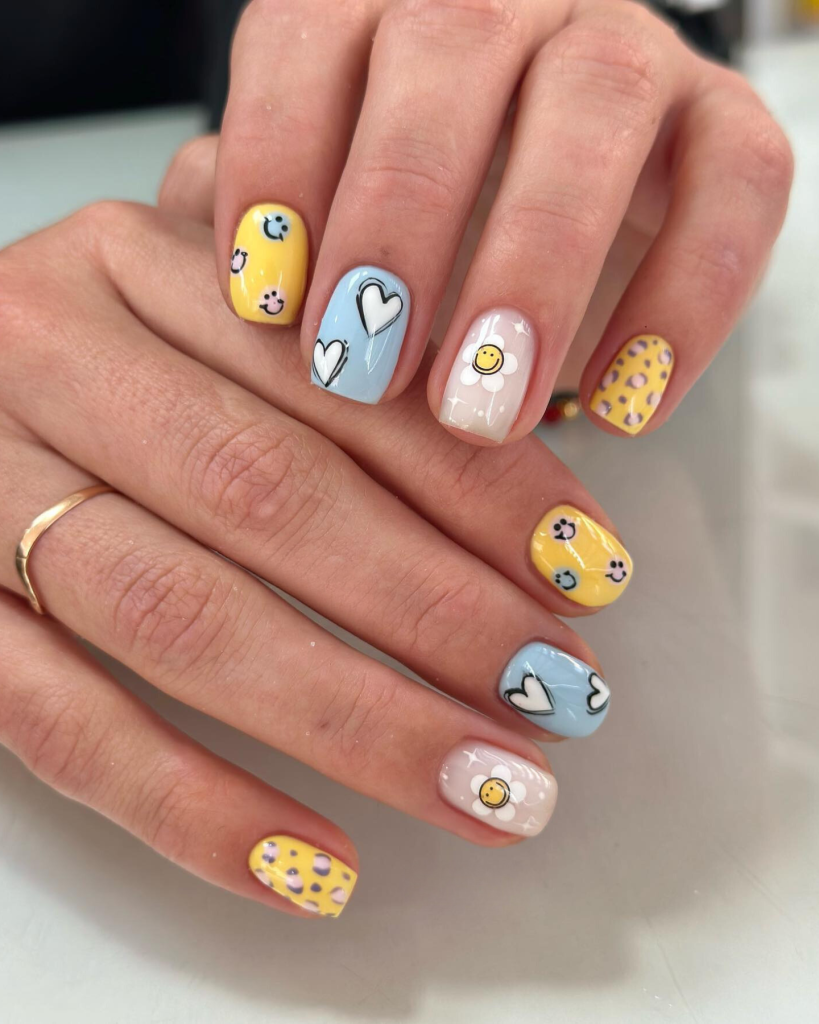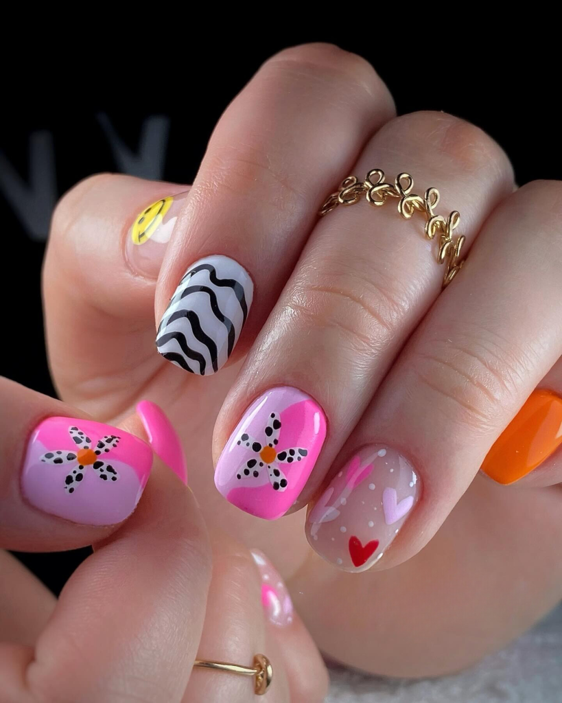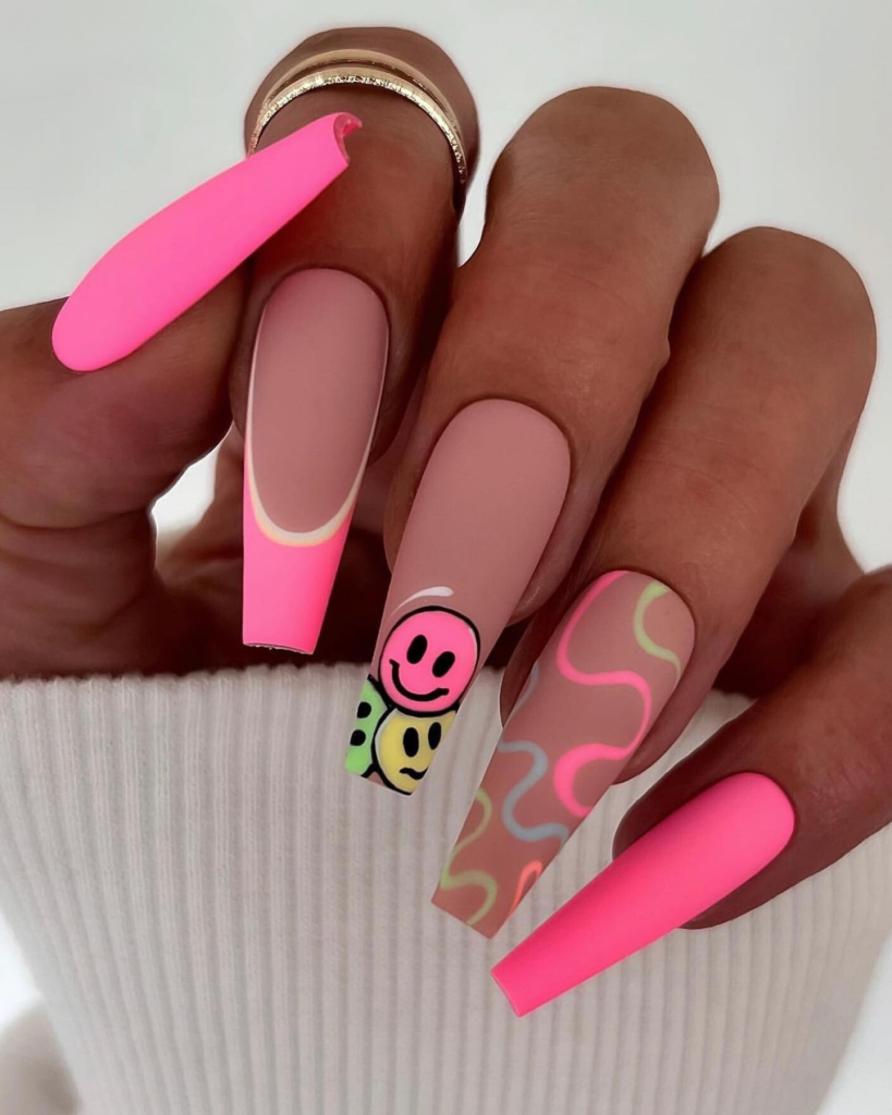Summer is another season that inspires a lot of playfulness, and these nails are entirely the same. The design made of bright almond shadows, soft pink hearts, and a happy face is an optimistic outlook on the summer season. The pale shades of pink make the bright color of the swirls and hearts stand out, providing a perfect base for the bright colors, making this mani similar to those light summer dresses or sandy beach days.