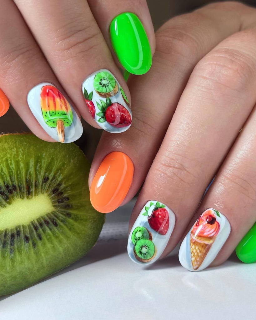 Nothing more effectively reminds people of summer than the presence of fresh fruits. This is the design that not only symbolizes a fruit basket but also does it in a fashionable style. The bright short gel nails are decorated with fruit motifs, such as watermelon, lemon, and peach, which are playful, arranged on pastel backgrounds that are so cute and absolutely refer to the season’s harvest. This design is not only attractive but also a great topic of discussion at summer parties or fruit-picking trips.