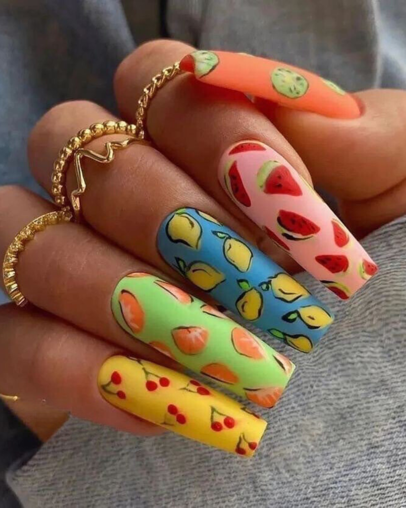 This nail art resembles a salad of fruits on your fingertips. It`s the quintessence of fresh and lively summer, with wonderfully designed kiwi, strawberry, and watermelon illustrations on the base of bright almond and orange colors. The gel nails symbolize the fruit saturation of the season and are guaranteed to make you the star of your next garden party or weekend trip.