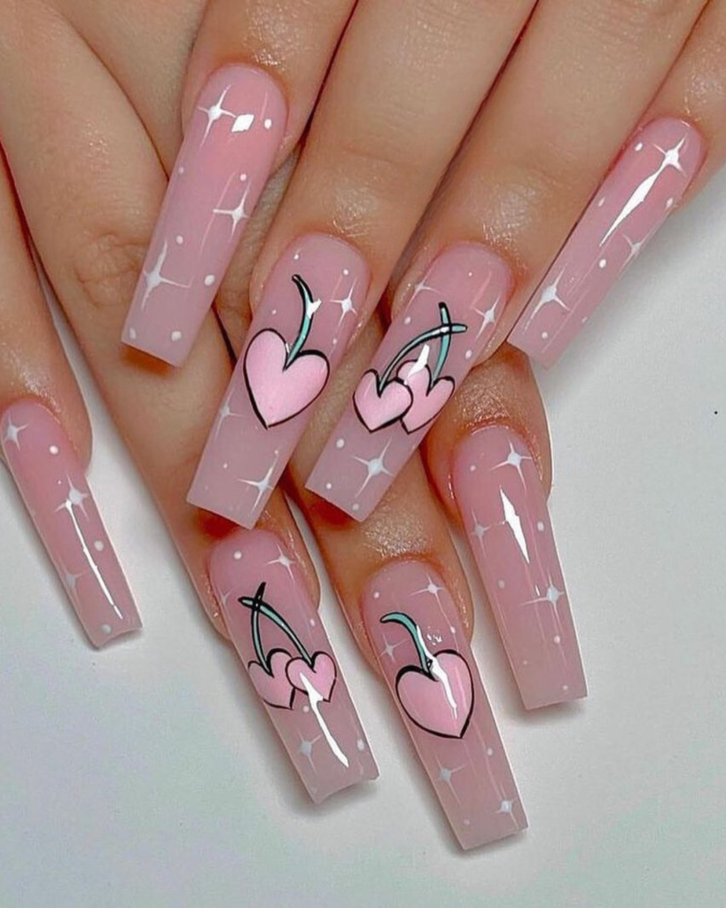 These square nails that are adorned with a beautiful starry twilight will take away your charm at the end of the day. The soft pink base with a scoop of sparkle is like the evening sky, while the cherry blossoms and stars dispersed all over the sky carry this sky to this magic. This design embodies the serenity and daydreaming of summer.