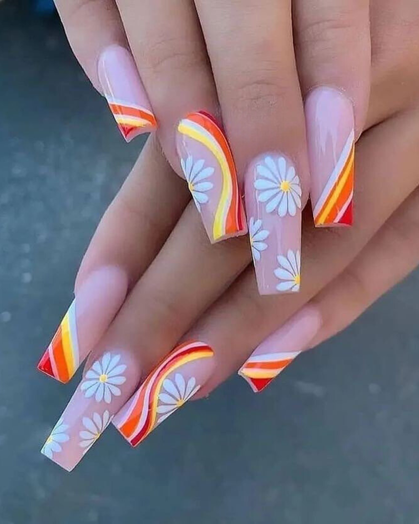 Kickstart your day with the tranquil vibes of a sunrise captured on your nails. This design features a light pink base with a shade of translucency that makes it look like the early morning sky. The sun’s rays are represented by bright orange and yellow stripes, which make the design warmer, while tiny white daisies representing a field illuminated by the white light of the sun are included in the design. It’s a cheerful and short design that reminds us of the peaceful times that exist just when the world wakes up.