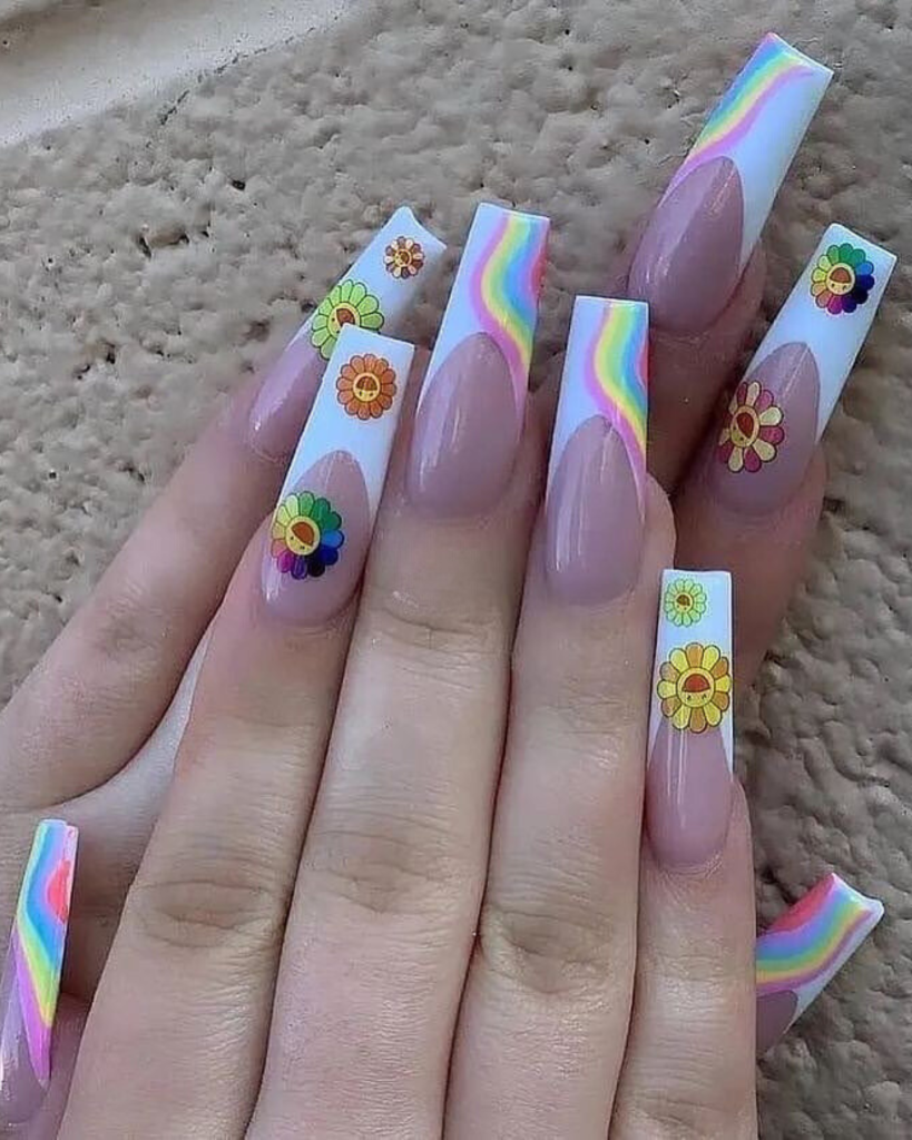 The sunset is going down, and the sky is changing its color to the canvas, and these nails illustrate everything to their fullest. The nails with the gradient shades of pink, blue, and yellow are like a view of a perfect summer sunset. The bright square tips give a modern look to the appearance, while the minimal flower and smiley face accents deliver a whimsy touch. It’s a short and bright design that’s as positive as a summer day is long.