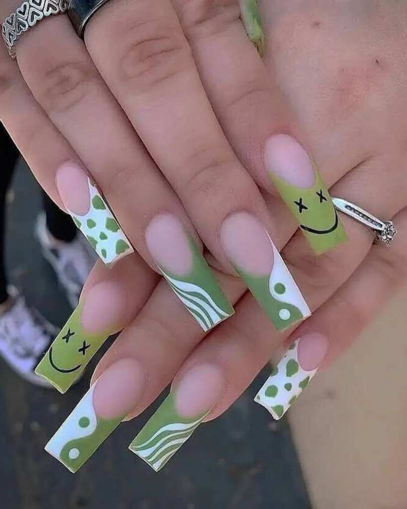 If there is a woman who enjoys a quirky lifestyle, then these playful green patterns acrylic short nails are heaven-sent for her. The happy faces, random dots, and loops mix of designs sum up this humorous and colorful style that is vivid and full of character. These nails are a way to begin interest at a city day out or a laid-back barbecue party.