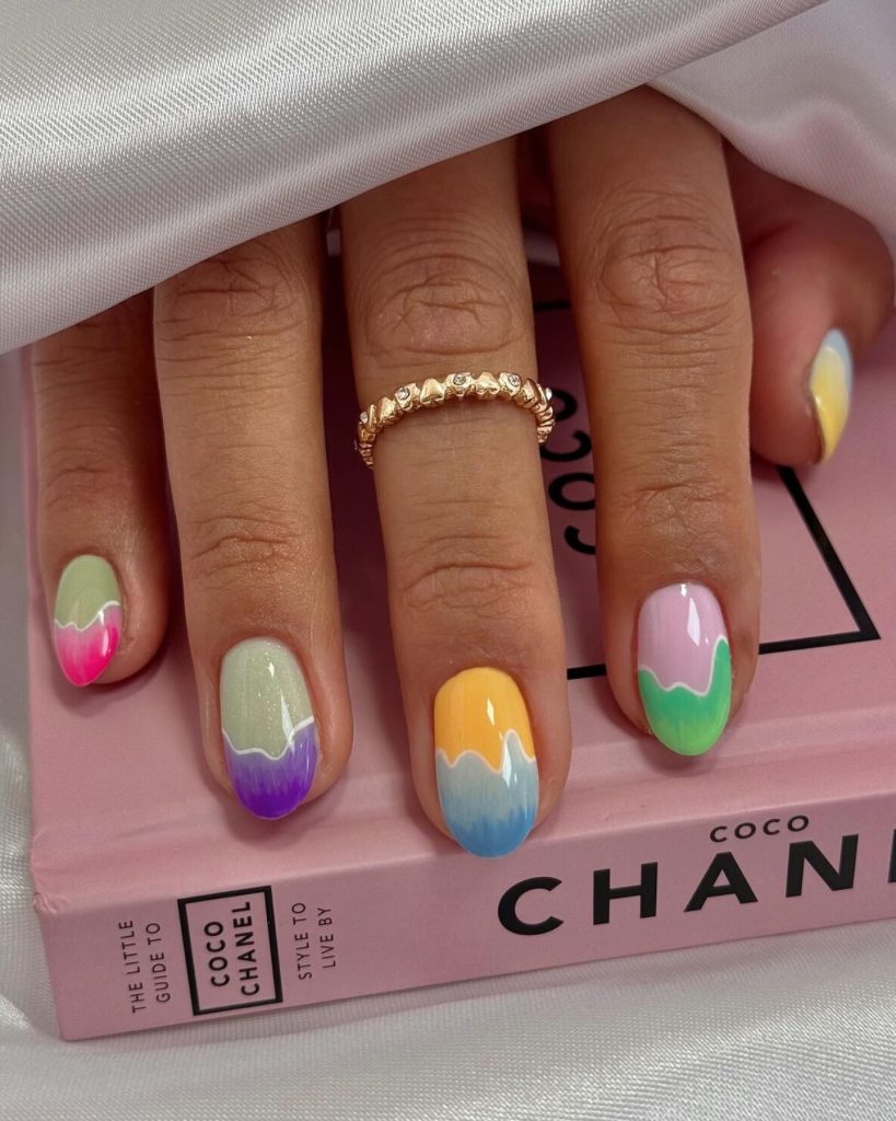 Just like paint oozing down a canvas, these nails are an astonishing piece of art. The pastel base shades work as a little soft background for the colorful droplet that seems to melt down each of the nails. This design is a chic yet striking short statement that is utterly full of the spirit of summer.