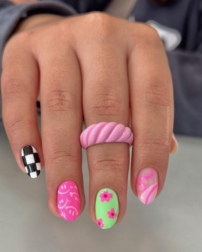 Acrylic short nails are not only fashionable, but they can also transport you back to those beautiful days of the past just like these nails do. They are designed in such a way that they remind one of the 1990s, the bright colors of which were so popular then. One of the nails is colored neon green and the second one is purple and has the number 23 in a retro-style font. They are indeed nails that are a throwback to the colorful era. The peace sign and smiley face on alternate nails besides being a touch of fun and cozy vibe are also very believable for the summer throwback parties or just hanging out with friends.