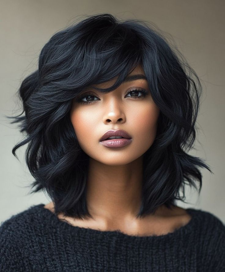 A simple yet elegant and mysterious look is given to a person with jet-black layered hair in a full style. This hair design will look incredibly attractive on dark skin as it will with its simplicity highlight the natural features of the girl wearing it. These soft waves and feathered bangs beautifully surround the face and that is why the hairstyle can be worn for both formal and casual occasions. Additionally, you can wear this short hair style on dark skin with both edgy accessories like statement or bold lipstick earrings. This stylish and low-maintenance chic will be your plan idea for 2025 beyond any doubt.
