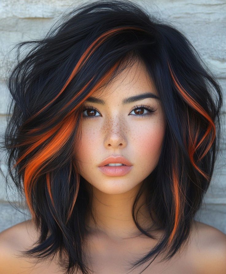 Vivid tangerine highlights on the pitch-black base make a striking and colorful combination. This hair-dye look is perfect for those who wish to add an element of warmth and energy to their hairstyles. The positioning of the orange strips is not only contemporary but also daring, so it is ideal for brown or dark-skinned women. Apply the look with nude makeup for the colors to speak or be daring with a matching lip color for the extra flair. The hair will stay bright only if you regularly use sulfate-free shampoos.
