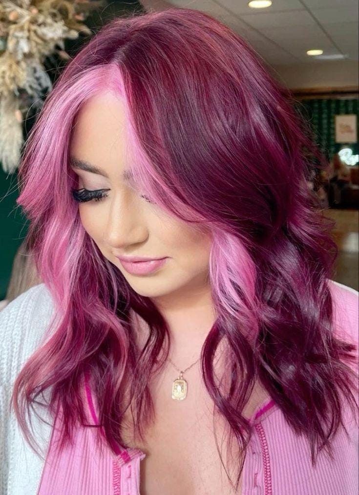 A playful combination of magenta and bubblegum pink brings this two-toned look to life. Ideal for women looking to make a statement, this style incorporates the half-and-half trend beautifully. The pink face-framing strands soften the look, while the magenta waves add depth and drama. Best suited for light skin tones, this hairstyle works well with minimal makeup or bright eyeliner for a fun, youthful vibe. Style tip: Loose curls enhance the contrast between the two shades, making the colors pop even more.