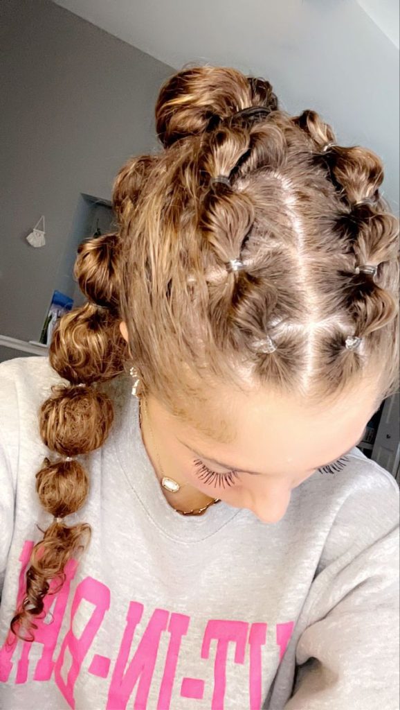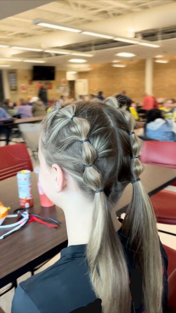 Kids can try out this adorable two bubble pigtail bun hairdo at school or cheer practice. The bubble ties are laid out in a regular design and are held in position with the help of invisible elastics. This makes them look both orderly and fun. It is worth noting that this hairstyle is mainly for students with short or medium hair and is thus a trendy option for casual cheerleading routines.