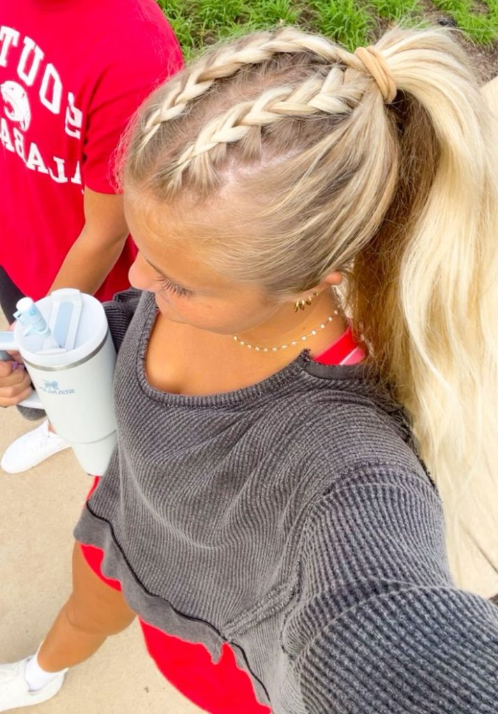 The typical hairstyle at school is the one made up of two tightly woven Dutch braids in the front. The braids form a spot of control that is tight and central, while the falling curls give a soft touch of delicacy. It is a very simple and elegant design for cheerleaders in high school who want to be between the strict and feminine forms. Bows or hairpins can be added to this hairstyle to make it more musical and spread the cheerleader spirit.