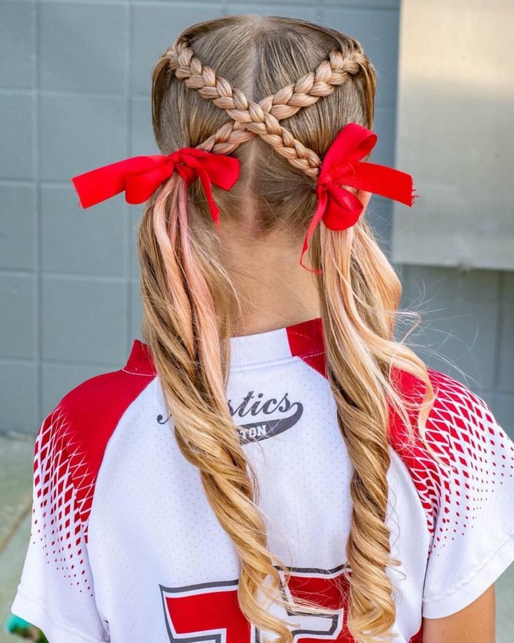 The beautiful layout attest to the braids with two interwoven pieces of hair going backward are arranged to form the garland with additional hanging loose twists which simulate a waterfall. Not only do they serve a purpose as a decoration, but the red bows found also give an extremely happy note to this hairstyle, which makes it ideal for the games or pep rallies to wear. This is a hairdo that can go with any hair length and it is a combined cut of traditional and modern styles.