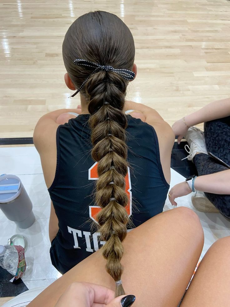 This chic ponytail is a knitted-into-braids on the scalp that makes it look unique and a definite change to a classical style. The use of a big braid tied at the end backs this hairstyle well by giving it a strong hold to make it sported during games or competitions. This hairstyle with rose uniforms not only looks decent but also provides a classy finish.