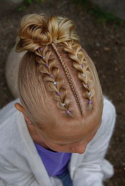 The hairdo comprises of three plaited bread braids and a thick top bun, which is the hairstyle yet complicated and fashionable. Solid bands in pastel shades are indeed a very simple choice for decoration but at the same time very cute. They make this style a perfect choice for various games or school activities.Promoting trendy looks, the hairdo is a fantastic way of keeping hair out of sight.