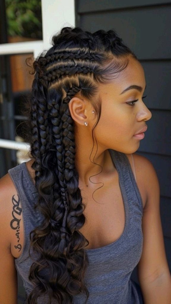 Queen of braids, decorated with graceful, face-framing curls, this hairdo is not only stylish but also practical. This is a black woman-friendly protective style that not only highlights the neatness but also adds a playful twist with the help of the free, curly tendrils. It is appropriate for a casual outing or a weekend trip; you can match it with bold makeup or a pair of statement earrings.
