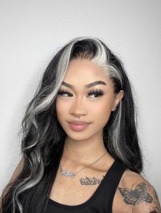 The collection finishes off with this very hairstyle which is a classic as it possesses soft, flowing waves and a bold white streak on one side. The opposite colors create a mix of timelessness and modernity, freely diverting the attention to the face and making a playful addition to the traditional black hair. Such a hairstyle is for all women who wish to trend skunk stripes with dignity and style.