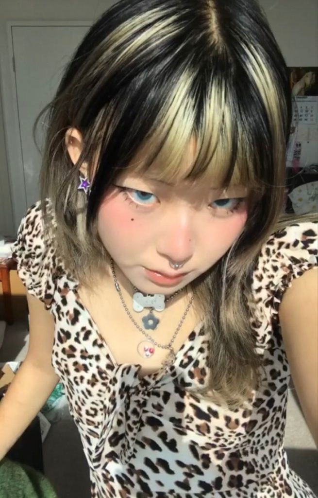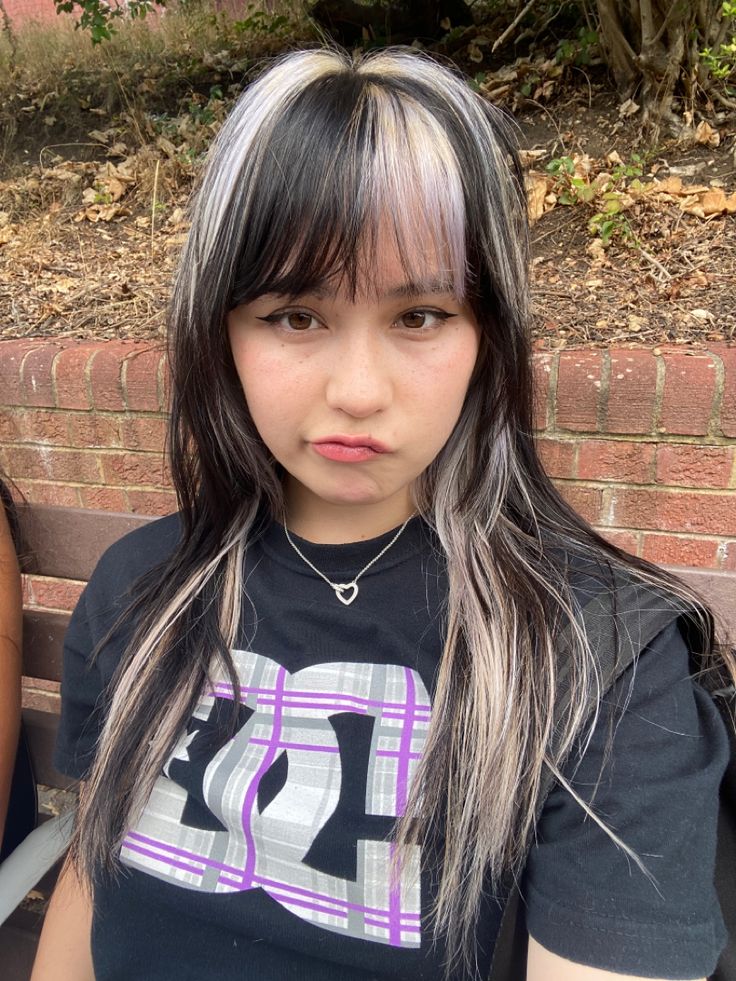 Based on the aesthetic of a scene, this manner integrates thick blonde streaks stacked on a natural black base. The fall of the bangs under the eyes gives a cheerful and esthetic young feeling, which is in addition to the random grouping of the stripes that show a creative and nonordinary design. This hairdo fits well with those ladies who are always keen on trying out colored accessories or extreme outfits. To show a bit of bohemian style mixed with the latest trend, you can wear it with a leopard print top or apply retro-style makeup.