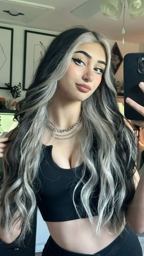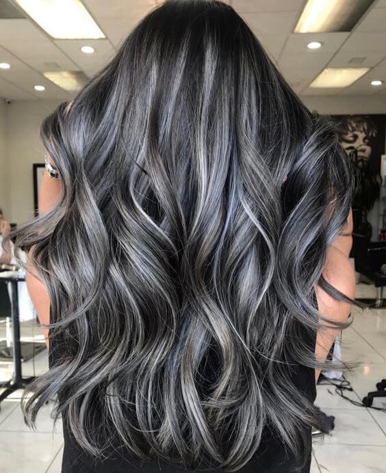 The described appearance exhibits a black-and-white trend that will never go out of style with the hairdo made of soft layered waves. The two face-framing white streaks are added to the hair and they are also the ones that are mixed in the most with the darker hair color that is a nature look but it is much striking. This hairstyle suits women who want a daring yet practical to wear every day blush look for a strong statement. A simple denim jacket or a white blouse would be the excellent matches with this hairstyle. Such an accessory can make the hairstyle look even more naturally cool.