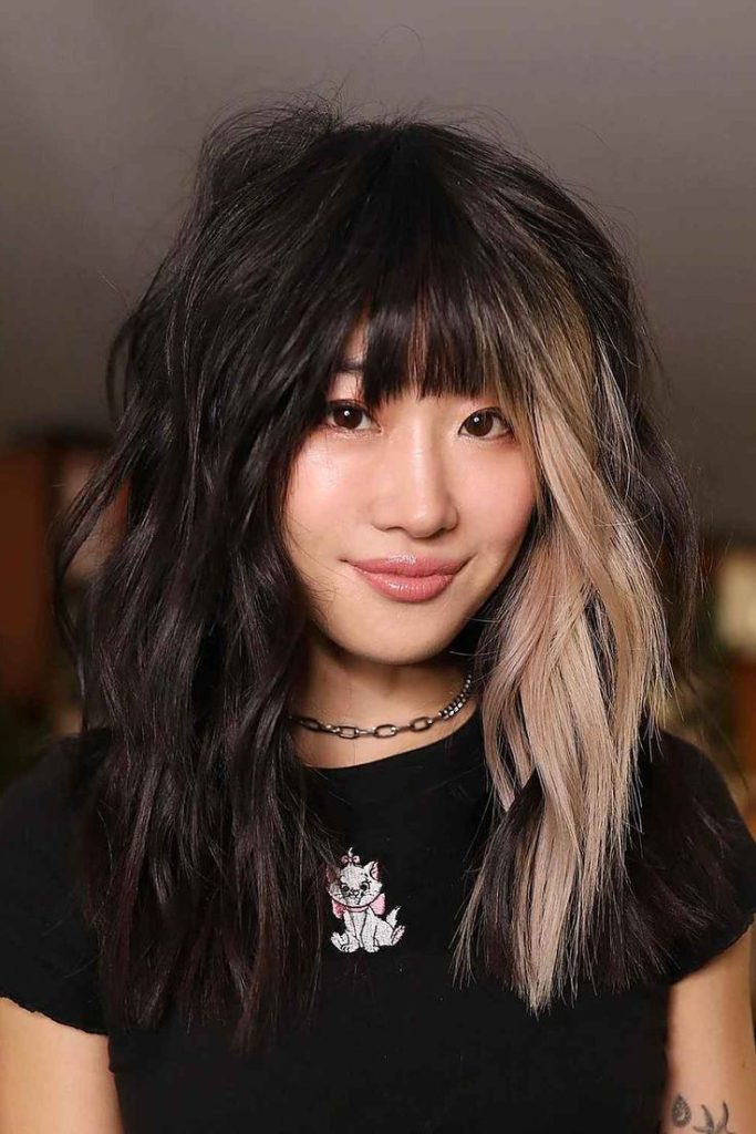 This option consists of two shades: black and white which mainly show off the curtain bangs spreading the face. The horizontal highlights take off from the root and point to the natural part of the hair while catching the layered tips’ end on the way. This hairstyle is suitable for oval and square face shapes, making it a simple but stylish or even a little bit rebellious look. Resume this hairdo with a striking red lips or a fashionable dress, and you will appear high-fashion which is suitable for date nights or other special occasions.