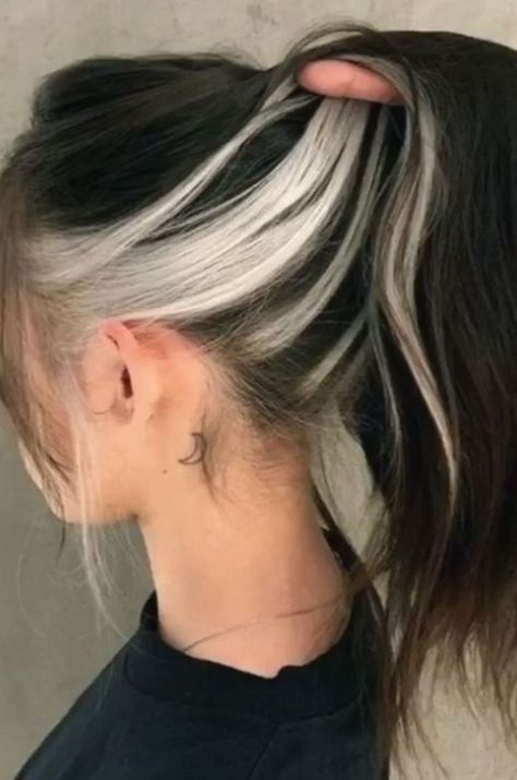 In a playful and innovative manner, this arrangement contains white peekaboo highlights which are placed under a black top layer. High ponytail for the styling effect makes the stripes more prominent and therefore, turns the hairstyle into an easier, dynamic, and fun option. This particular design is best for casual outings and gym sessions, as it presents a quirky look on the skunk stripe trend without stressing it too much. Create a cohesive appearance by wearing it with athleisure or casual clothes.